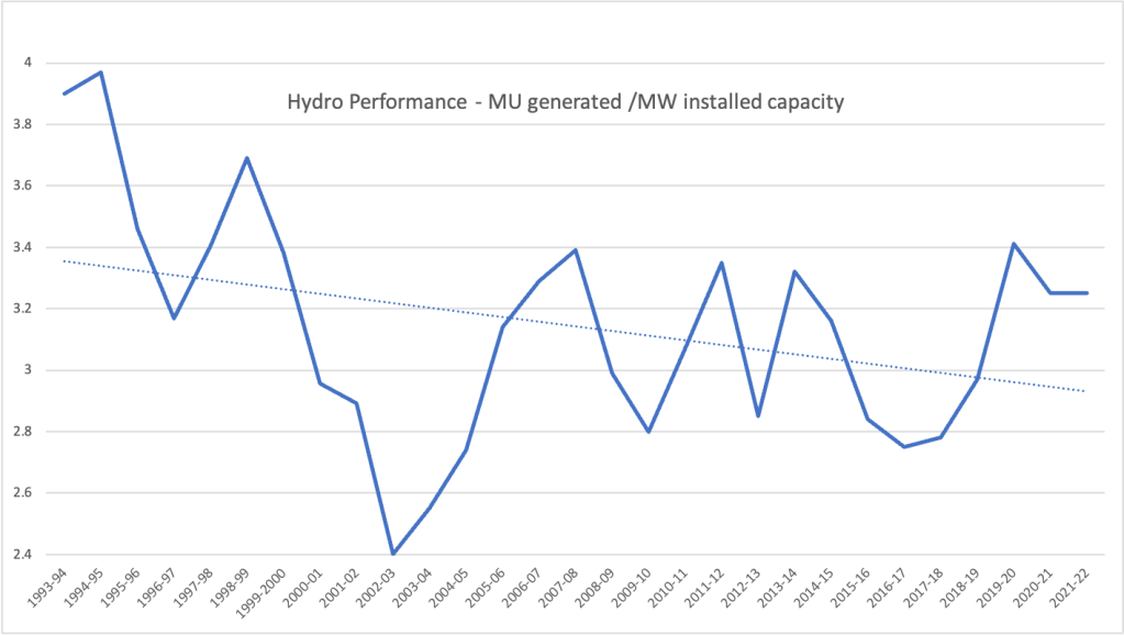 Diminishing returns, Declining proportion However, power generation from hydropower projects continues to show diminishing returns, as has been the story close to three decades now, see the trend-line in graph below where we have plotted MU electricity generated per MW hydro installed capacity over the years since 1993-94.