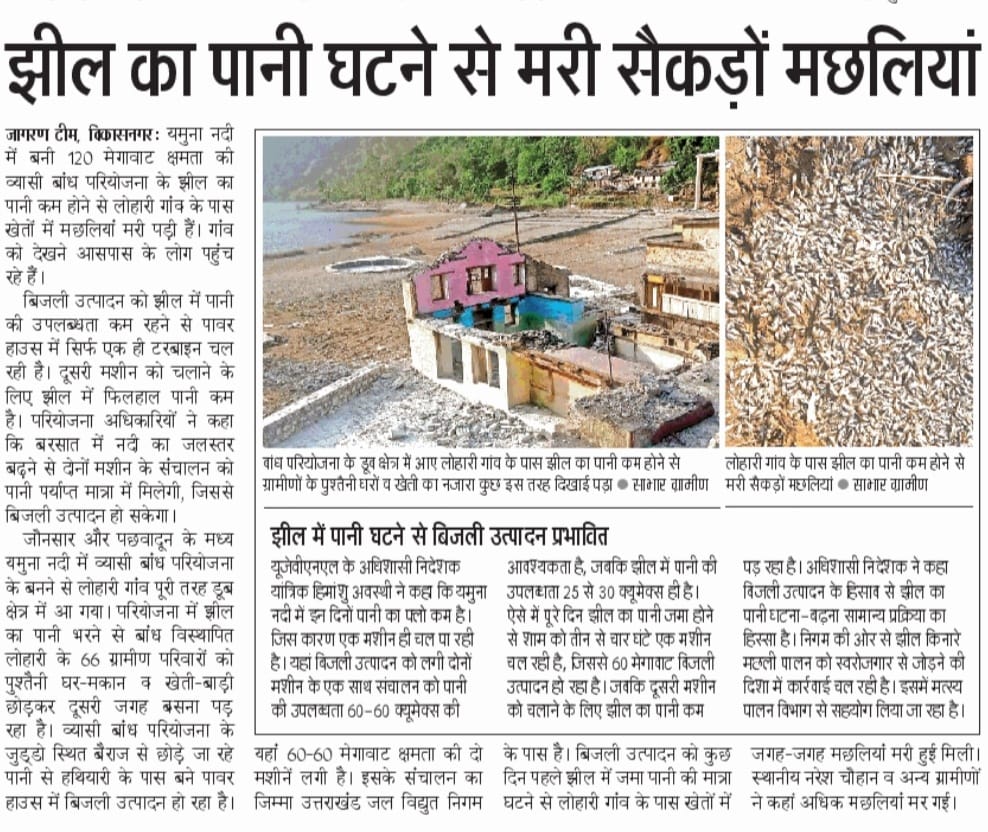 Uttarakhand Fears of ‘devastation’ from the largest dam on Yamuna In the last week of December, one of the two turbines at the Vyasi dam were tested, according to Yashpal Thakur, a member of the Yamuna Sanitation Committee. The water level of the Yamuna fell dramatically on the 29th, two days before the turbine was tested. “People were afraid that the Yamuna had dried up completely. The fish came to the surface as the water receded,” says Tomar, describing onlookers “hitting the fish with sticks and some with stones, as they flopped around” so they could take them to eat or sell. “It was a very heart breaking scene,” he says, his voice trembling. https://www.thethirdpole.net/en/energy/lakhwar-vyasi-project-fears-of-devastation-yamuna-river/ (24 Jan. 2022)