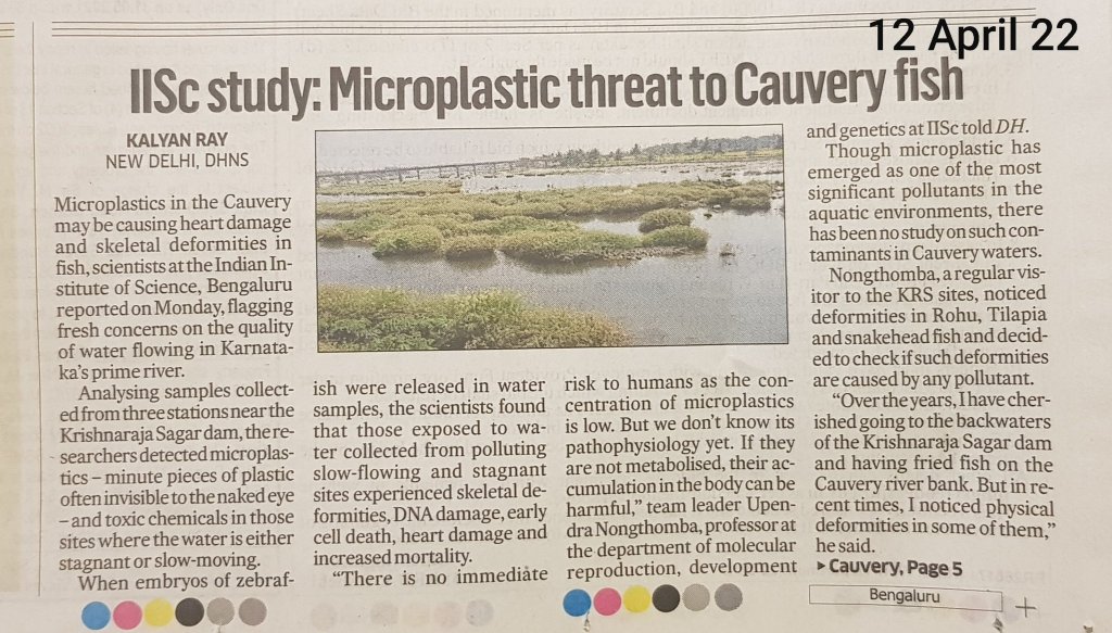 Though microplastic has emerged as one of the most significant pollutants in the aquatic environments, there has been no study on such contaminants in Cauvery waters. Oxygen deficient water along with microplastic and other chemical contaminants might be the reason behind the skeletal deformities and heart damage in fish, the researchers said, noting further research would be needed to understand how microplastics were absorbed from the gut and which organs would be the most susceptible. “Over the last 20 years, there has been a drastic decline in the number of fish species in Cauvery river and the quantity of the fish captured. Microplastic could be a plausible reason because the embryos are more susceptible. But we need more research,” he said. https://www.deccanherald.com/national/microplastic-pollution-in-cauvery-river-may-pose-threat-to-fish-says-iisc-study-1099861.html (11 April 2022)