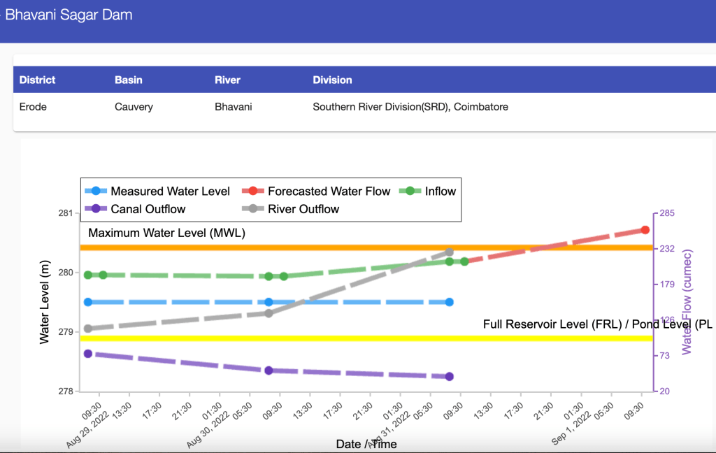 The case of Bhavani Sagar dam also in Cauvery basin is interesting. Here the water level is above FRL and now outflow is higher than inflow as we can see from this CWC hydrograph showing the situation during Aug 29-Aug 31 and forecast for Sept 1.