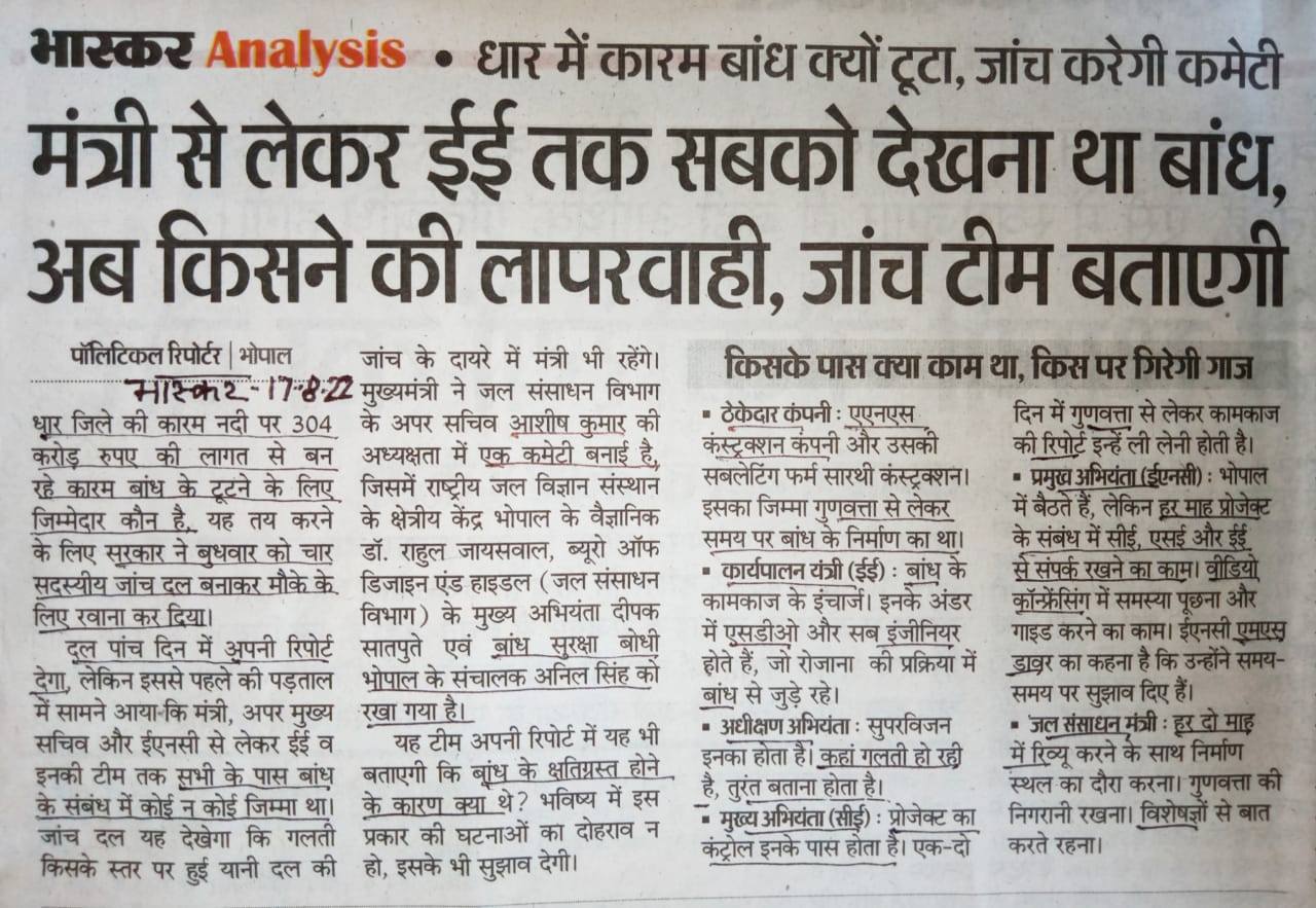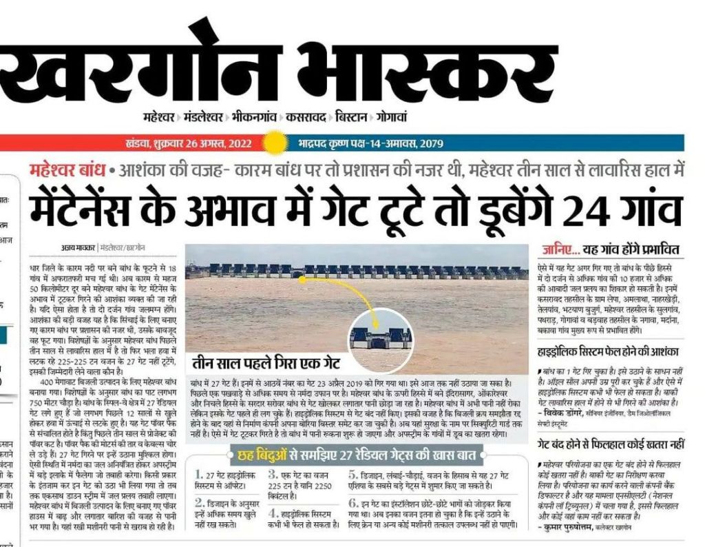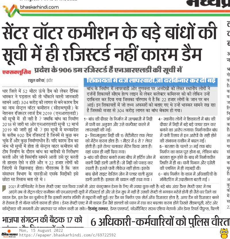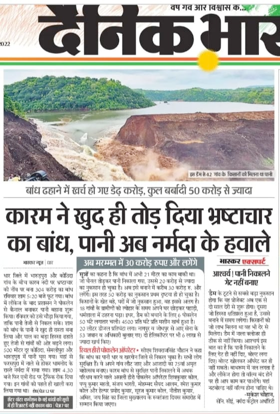 Dainik Bhaskar, Aug 15 2022 quotes SANDRP on the issue of Karam flood disaster in Madhya Pradesh. Karam Dam demolition cost is Rs 1.5 cr, the cost of repair will be Rs 30 Cr.