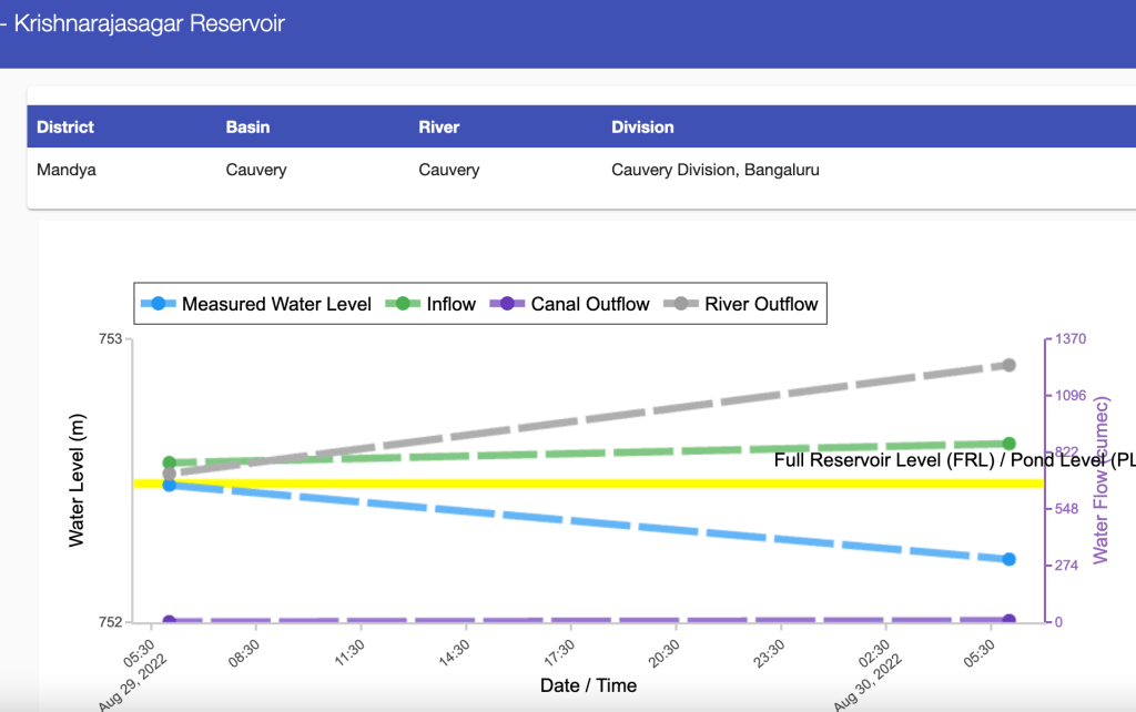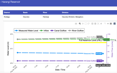 Around 7,500 cusecs of water is being released from Harangi reservoir which has added to the pressure on the downstream KRS dam, which is discharging 78,614 cusecs of water. Although the inflow is 66,345 cusecs, the dam authorities are not taking any chances as there are indications that the inflow could spike given incessant rainfall in the catchment areas of the KRS dam. https://timesofindia.indiatimes.com/city/mysuru/water-discharge-from-dams-rises-cauvery-is-in-spate/articleshow/93382918.cms (06 Aug. 2022)