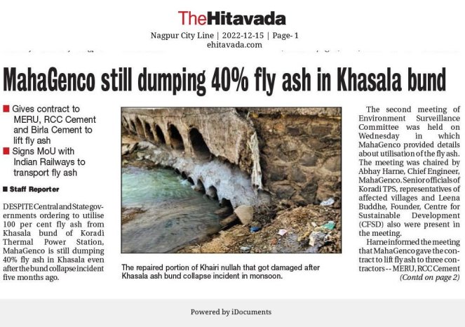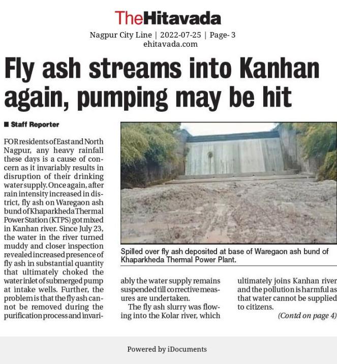 According to the complaint, fly ash was being unscientifically discharged by Koradi and Khaparkheda power plants even before the mishap. “The matter got so serious that Nagpur Municipal Corporation (NMC) and Orange City Waterworks have been forced to stop lifting of water from one side of Kanhan river due to fly ash contamination,” it stated. https://timesofindia.indiatimes.com/city/nagpur/ngos-approach-pmo-for-action-against-koradi-fly-ash-bund-breach/articleshow/93306810.cms (03 Aug. 2022) Notably, in April 2017 also, the PMO had sought action on the various irregularities at the Koradi Thermal Power Plant asking for an action taken report in 15 days. https://timesofindia.indiatimes.com/city/nagpur/pmo-seeks-report-on-koradi-plant-irregularities/articleshow/58268837.cms (20 April 2017)