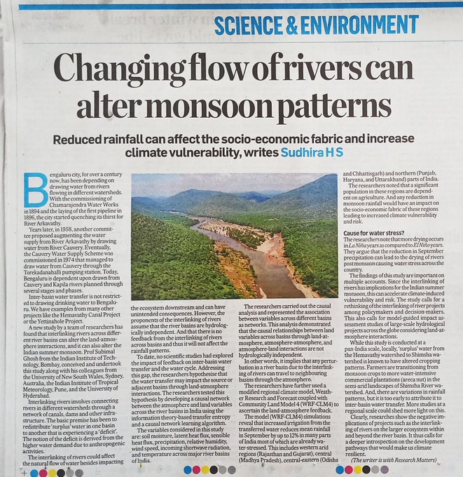 Study Changing flow of rivers can alter monsoon patterns A new study has found that inter basin transfer of water can alter the land climate interactions and rainfall pattern. The study was done by scientists of IIT-B, IITM, University of Hyderabad and University of New South Wales. No scientific study so far has been done about the feedback impact of any such water transfer. The study showed that land atmosphere, atmosphere to atmosphere and atmosphere to land interactions are not independent of hydrology.