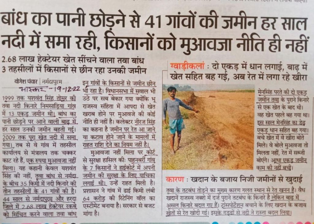 Madhya Pradesh DAM FLOODS: Thousands of farmers of 41 villages of three tehsils of Narmadapuram dist in MP along 35 km of river downstream of the Tawa dam have been facing submergence of their farms since 1999, but there is no policy for compensation and they have received none. Land revenue code has no provision for such disaster losses. https://www.bhaskar.com/local/mp/narmadapuram/news/due-to-the-release-of-water-from-the-dam-the-land-of-41-villages-got-absorbed-in-the-river-every-year-there-is-no-compensation-policy-for-the-farmers-130692776.html (19 Dec. 2022)