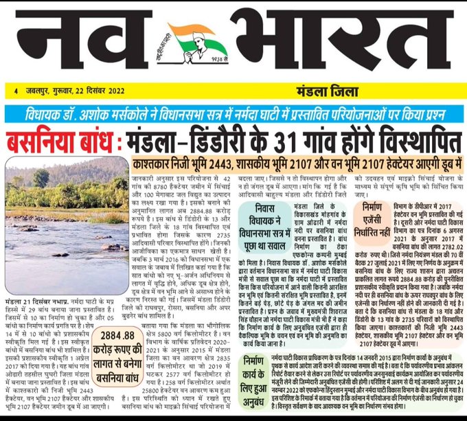 Madhya Pradesh Raj Kumar Sinha:-2009 – 2010 में नर्मदा नदी पर प्रस्तावित बसनिया बांध से 50 हजार हेक्टेयर में सिंचाई और 20 मेगावाट विद्युत उत्पादन का लक्ष्य था। अब 8780 हेक्टेयर में सिंचाई और 100 मेगावाट विद्युत उत्पादन का लक्ष्य रखा गया है।हरित उर्जा के नाम पर 2107 हे जंगल डूबेगा।