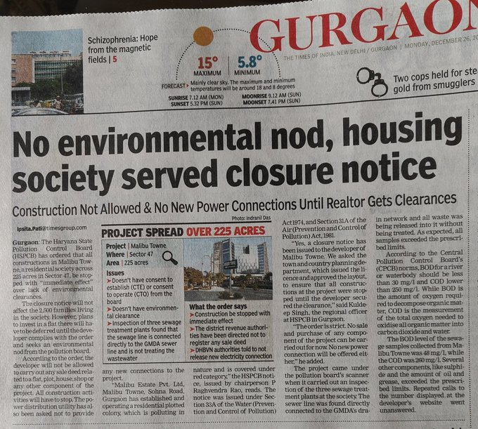 Gurugram No environmental nod, housing society served closure notice The Haryana State Pollution Control Board (HSPCB) has ordered that all constructions in Malibu Towne, a residential society across 225 acres in Sector 47, be stopped with “immediate effect” over lack of environmental clearances. According to the order, the developer will not be allowed to carry out any sale deed related to a flat, plot, house, shop or any other component of the project. All construction activities will have to stop. The power distribution utility has also been asked not to provide any new connections to the project.
