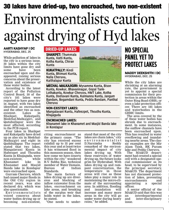 Four lakes in Shaikpet and Kukatpally have dried up as also six in Medchal-Malkajgiri and eight in Quthbullapur. The report stated that two lakes, Mangalavani Kunta in Hafeezpet and Thouthu Kunta in Khajaguda, were non-existent, while Khanamet lake in Khanamet and Masjid Banda lake in Kondapur were encroached upon. Gurram Cheruvu, which had caused major floods in the Old City region in recent years, was also declared dry, which was also questionable.