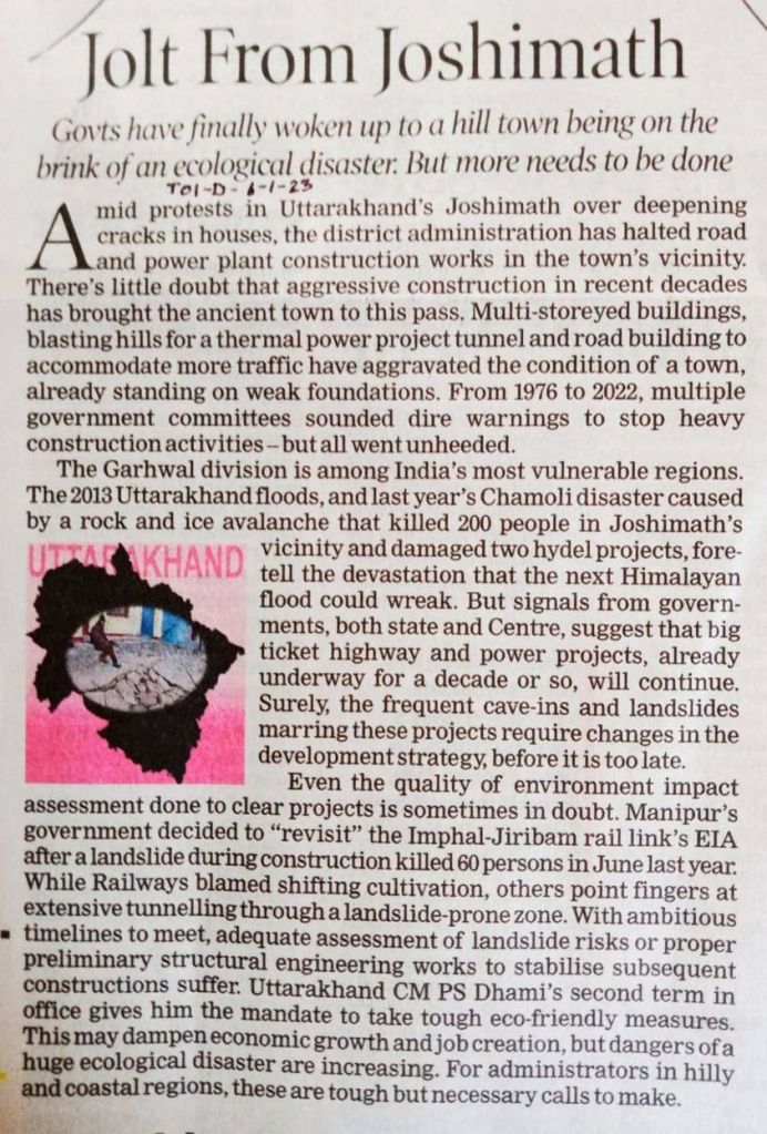 Good to see this Edit in The Times of India on Jan 6, 2023 recommending review of the major hydropower projects and other such infrastructure projects in ecologically fragile himalayan areas like Joshimath in Chamoli dist of Uttarakhand. Unfortunately, the edit talks about tunnel of a thermal power project when it is for hydropower project. https://timesofindia.indiatimes.com/blogs/toi-editorials/jolt-from-joshimath-govts-have-finally-woken-up-to-a-hill-town-being-on-the-brink-of-an-ecological-disaster-but-more-needs-to-be-done/ (05 Jan. 2023)