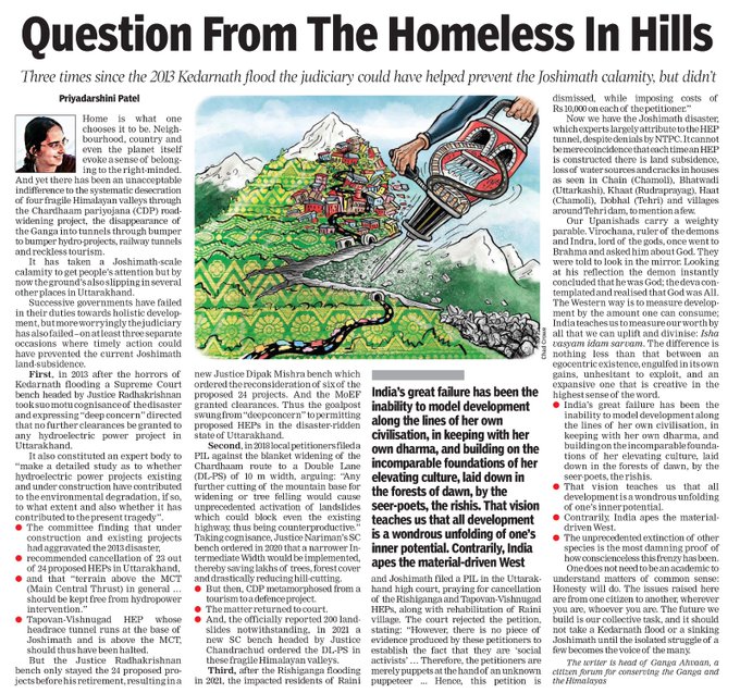 Priyadarshini Patel:- Home is what one chooses it to be. Neighbourhood, country and even the planet itself evoke a sense of belonging to the right-minded. And yet there has been an unacceptable indifference to the systematic desecration of four fragile Himalayan valleys through the Chardhaam pariyojana (CDP) road-widening project, the disappearance of the Ganga into tunnels through bumper to bumper hydro-projects, railway tunnels and reckless tourism. It has taken a Joshimath-scale calamity to get people’s attention but by now the ground’s also slipping in several other places in Uttarakhand. https://timesofindia.indiatimes.com/india/question-from-the-homeless-in-hills/articleshow/97380438.cms (27 Jan. 2023)