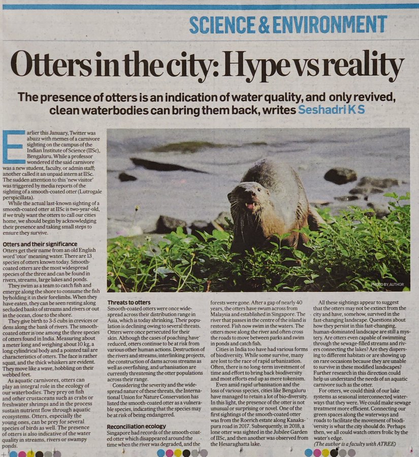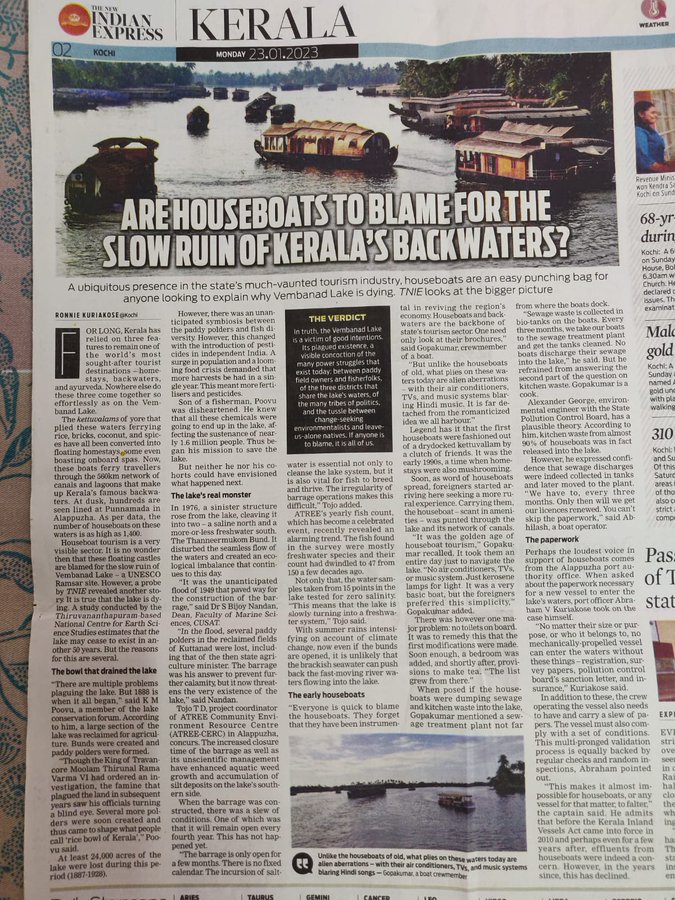 ATREE’s yearly fish count, which has become a celebrated event, recently revealed an alarming trend. The fish found in the survey were mostly freshwater species and their count had dwindled to 47 from 150 a few decades ago. Not only that, the water samples taken from 15 points in the lake tested for zero salinity. “This means that the lake is slowly turning into a freshwater system,” Tojo said. With summer rains intensifying on account of climate change, now even if the bunds are opened, it is unlikely that the brackish seawater can push back the fast-moving river waters flowing into the lake. https://www.newindianexpress.com/states/kerala/2023/jan/23/are-houseboats-to-blame-for-theslow-ruin-of-keralas-backwaters-2540428.html (23 Jan. 2023)