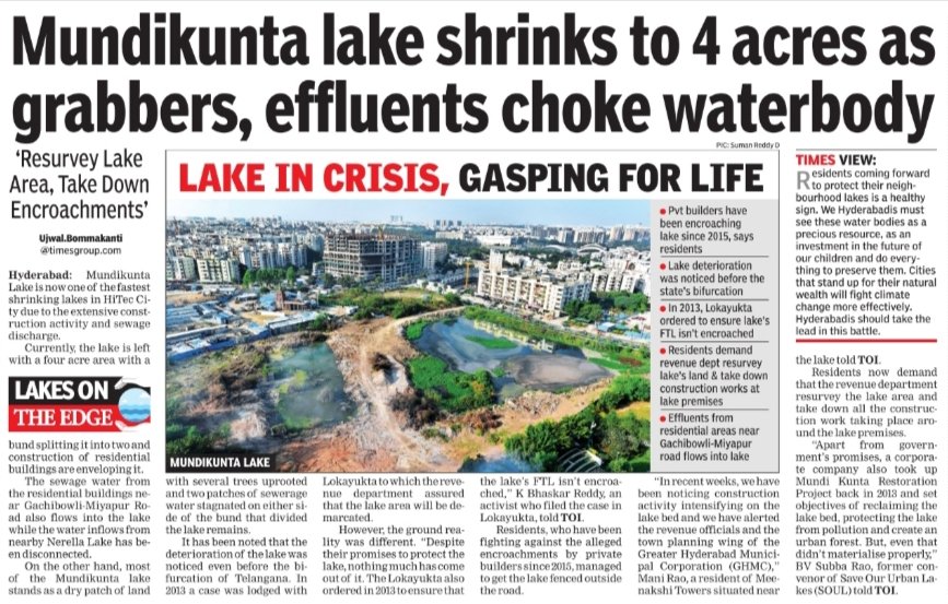 Residents, who have been fighting against the alleged encroachments by private builders since 2015, managed to get the lake fenced outside the road. “In recent weeks, we have been noticing construction activity intensifying on the lake bed and we have alerted the revenue officials and the town planning wing of the Greater Hyderabad Municipal Corp (GHMC),” Mani Rao, a resident of Meenakshi Towers situated near the lake said. Residents now demand that the revenue dept resurvey the lake area and take down all the construction work taking place around the lake. https://timesofindia.indiatimes.com/city/hyderabad/mundikunta-lake-shrinks-to-4-acres-as-grabbers-effluents-choke-waterbody-in-telangana/articleshow/96411788.cms (22 Dec. 2022)