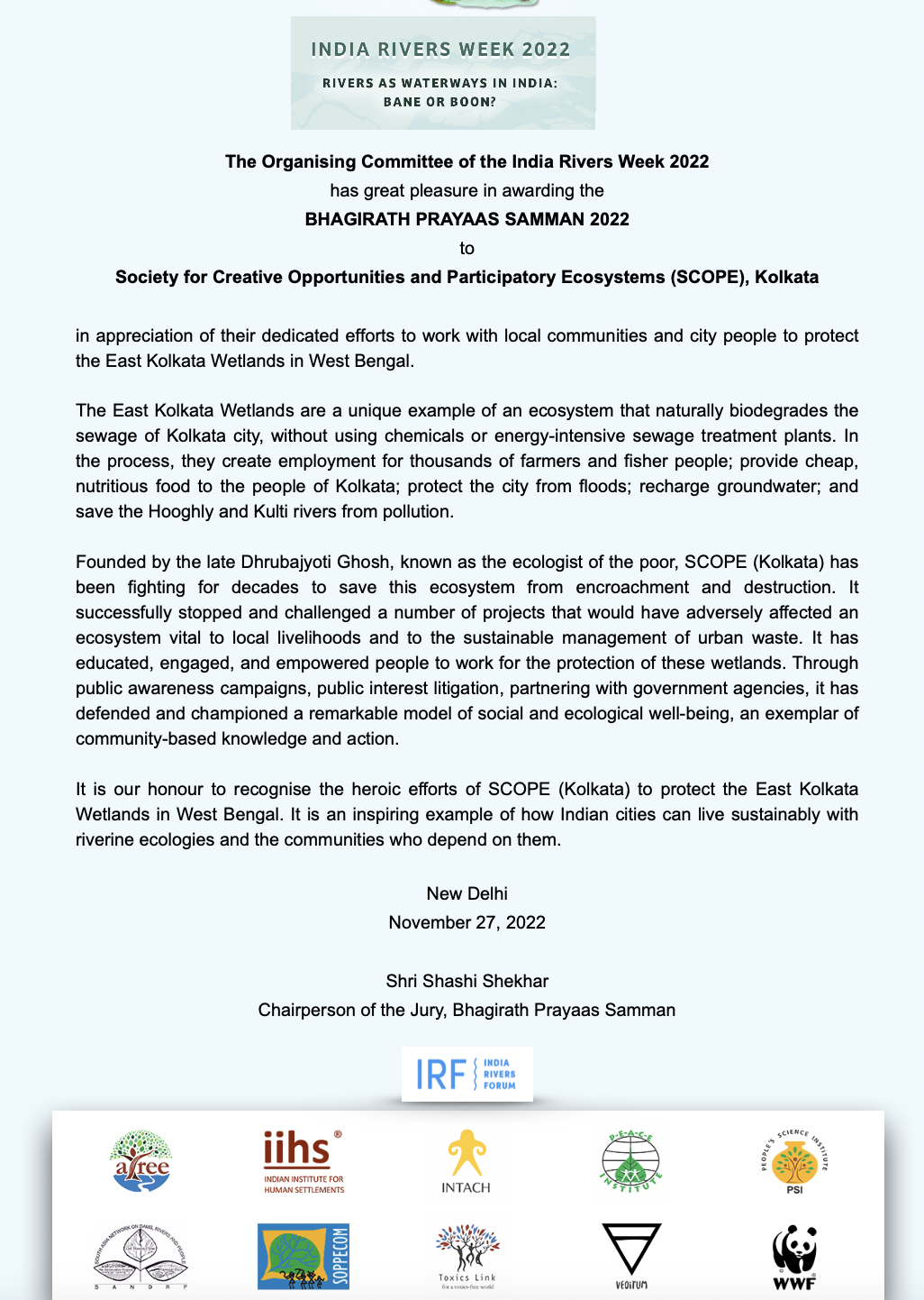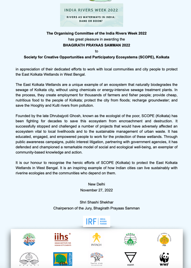 3. West Bengal Bhagirath Prayas Samman (BPS) Award 2022 to SCOPE-Kolkata The citation from the India Rivers Forum for the BPS award 2022 in organisation category (see the photo of full citation below) to Society for Creative Opportunities and Participatory Ecosystems (SCOPE-Kolkata) said, among other things: “Founded by the late Dhrubajyoti Ghosh, known as the ecologist of the poor, SCOPE (Kolkata) has been fighting for decades to save this ecosystem from encroachment and destruction. It successfully stopped and challenged a number of projects that would have adversely affected an ecosystem vital to local livelihoods and to the sustainable management of urban waste. It has educated, engaged, and empowered people to work for the protection of these wetlands. Through public awareness campaigns, helping the affected people in public interest litigation, partnering with government agencies, it has defended and championed a remarkable model of social and ecological well-being, an exemplar of community-based knowledge and action. It is our honour to recognise the heroic efforts of SCOPE (Kolkata) to protect the East Kolkata Wetlands in West Bengal. It is an inspiring example of how Indian cities can live sustainably with riverine ecologies and the communities who depend on them.”