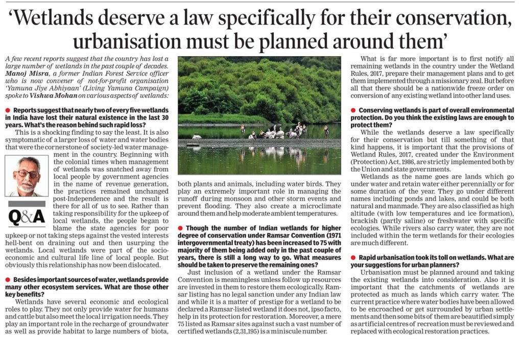 Manoj Misra, a former IFS officer who is now convener of ‘Yamuna Jiye Abhiyaan’ spoke on various aspects of wetlands. https://timesofindia.indiatimes.com/india/wetlands-deserve-a-law-specifically-for-their-conservation-urbanisation-must-be-planned-around-them/articleshow/97010421.cms (15 Jan. 2023)