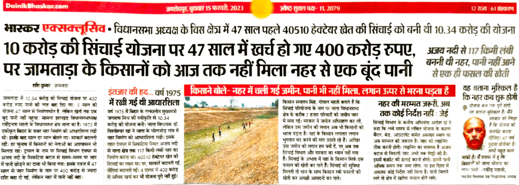 Jharkhand Interesting case of an irrigation canal project on Ajoy River started in 1975 at a cost of Rs 10.34 Cr, to be completed in 5 years. The 117 km long canal has been built, but 47 years later and after spending over Rs 400 Cr, the canal has not irrigated any land.