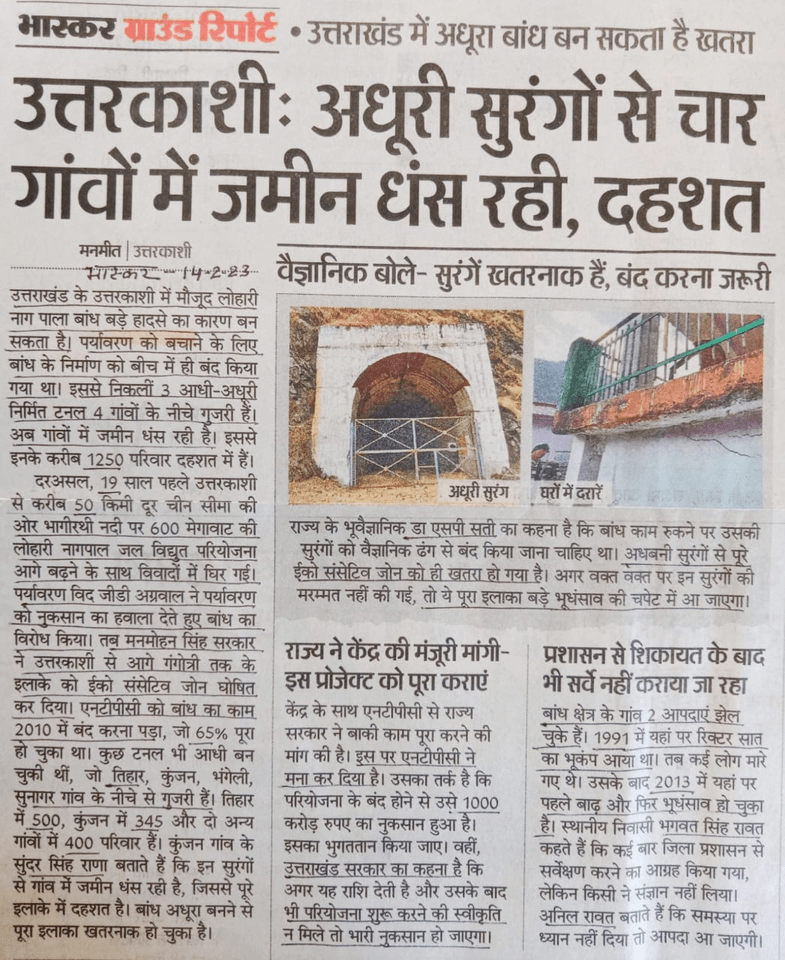 According to this report, due to the incomplete, abandoned tunnels of the cancelled Loharinag Pala hydropower project of NTPC in Uttarkashi district, there is land subsidence in four villages of Uttarakhand.