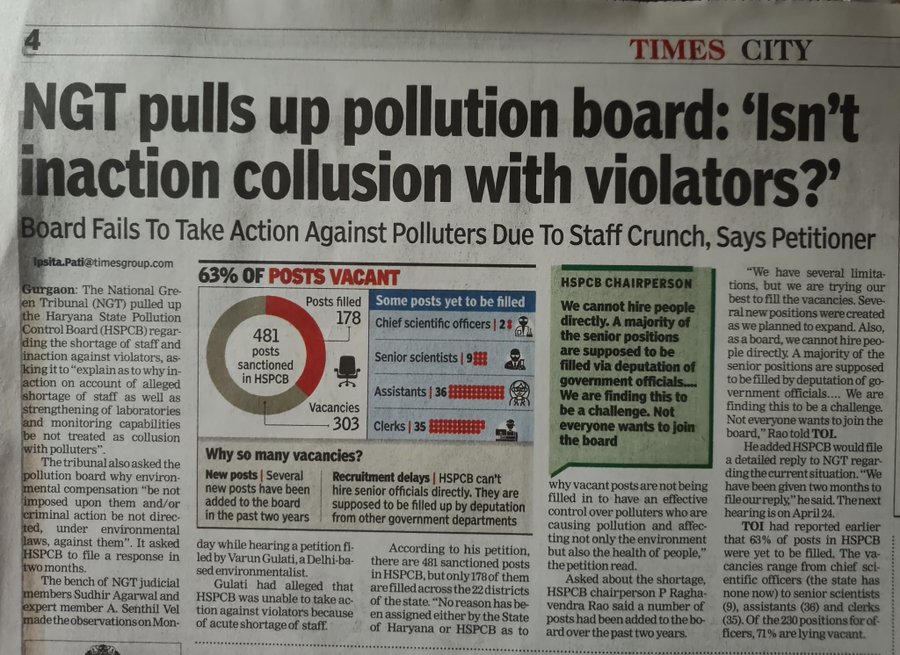 According to petition filed by Varun Gulati, a Delhi-based environmentalist, there are 481 sanctioned posts in HSPCB, but only 178 of them are filled across the 22 districts of the state. “No reason has been assigned either by the State of Haryana or SPCB as to why vacant posts are not being filled in to have an effective control over polluters who are causing pollution and affecting not only the environment but also the health of people,” the petition read. TOI had reported earlier that 63% of posts in HSPCB were yet to be filled. The vacancies range from chief scientific officers (the state has none now) to senior scientists (9), assistants (36) and clerks (35). Of the 230 positions for officers, 71% are lying vacant. https://timesofindia.indiatimes.com/city/gurgaon/ngt-pulls-up-pollution-board-isnt-inaction-a-collusion-with-violators/articleshow/98136909.cms (22 Feb. 2023)