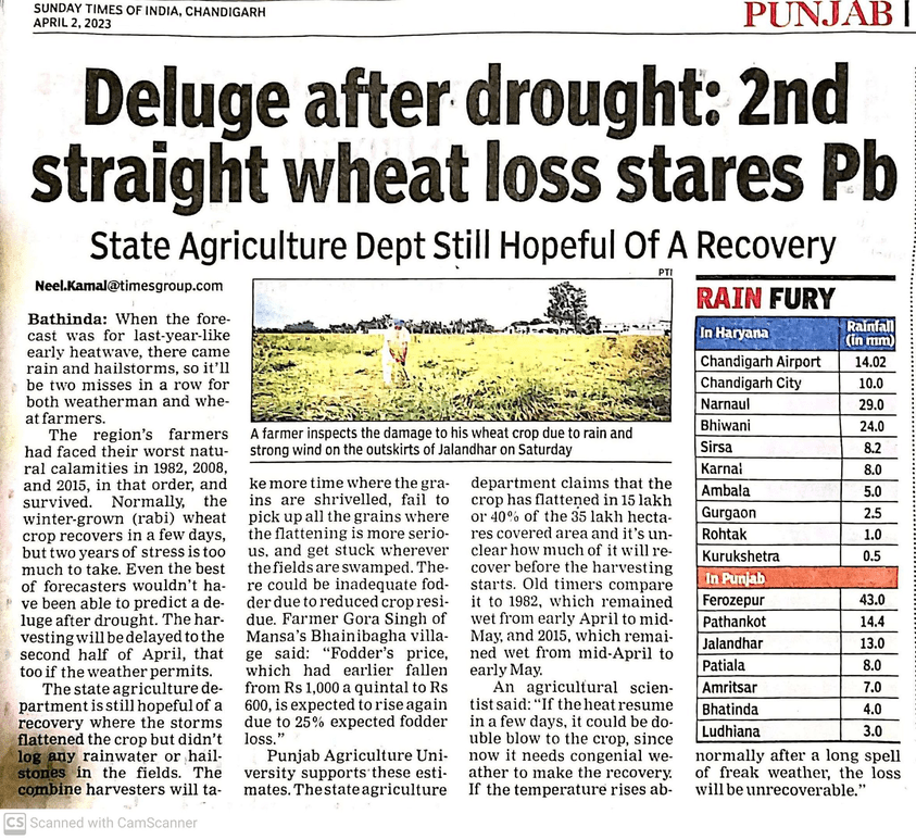 The region’s farmers had faced their worst natural calamities in 1982, 2008, and 2015, in that order, and survived. https://timesofindia.indiatimes.com/city/chandigarh/as-rain-continues-pb-stares-at-2nd-straight-wheat-loss/articleshow/99181621.cms (02 April 2023)
