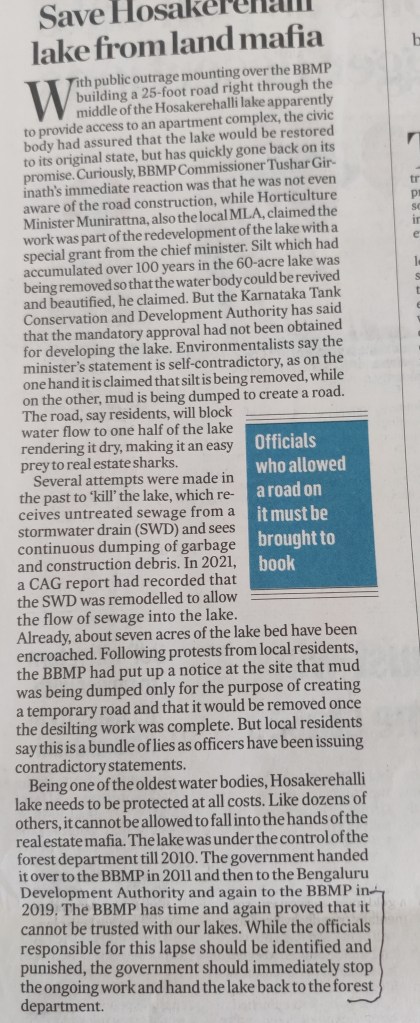 EDIT in Deccan Herald on March 30 2023: “The BBMP has time and again proved that it cannot be trusted with our lakes. While the officials responsible for this lapse should be identified and punished, the govt should immediately stop the ongoing work and hand the lake back to the forest department.”