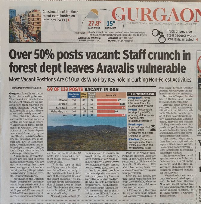 For instance, the Gurgaon forest department currently has 20 forest guards, out of a sanctioned strength of 62. In total, 69 posts of 133 are vacant. Nuh has 22 forest guards out of 62. The district’s total vacancies climb up to 91, of the 141 posts. The Faridabad department has 143 posts, of which 93 are to be filled. A 2022 report by the Forest Survey of India said Gurgaon had lost nearly 2.5sqkm of forest cover between October 2019 and February 2020, the highest for any district in the state. Nuh lost 0.55sqkm, Faridabad, 0.71sqkm, and Palwal, 0.41sqkm, in the same time. https://timesofindia.indiatimes.com/city/gurgaon/over-50-posts-vacant-staff-crunch-in-forest-department-leaves-aravalis-vulnerable/articleshow/99198500.cms (03 April 2023)