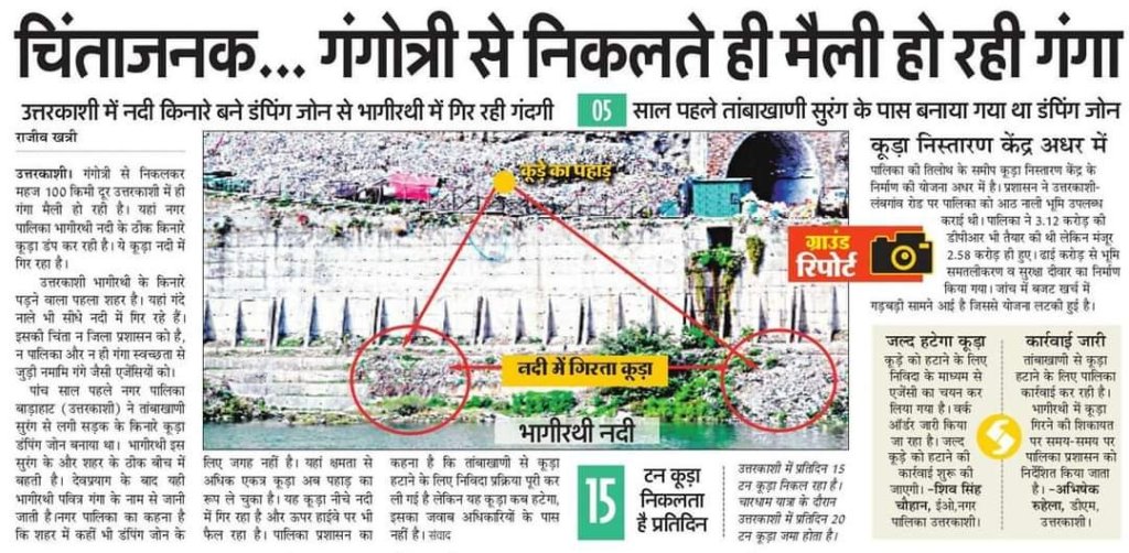 डंपिंग जोन से भागीरथी में गिर रही गंदगी Bhagirathi (Ganga) is getting polluted as it comes out of Gangotri due to dumping ground next to the river. अपने मायके गंगोत्री से महज 100 किमी की दूरी पर ही गंगा मैली हो रही है। यहां भागीरथी नदी के ठीक किनारे नगर पालिका सारे शहर का कूड़ा डंप कर रही है। यह कूड़ा सीधे नदी में गिर रहा है। गंगोत्री के बाद पड़ने वाले पहले ही शहर के कई गंदे नाले भी सीधे भागीरथी में गिर रहे हैं। गंगा अपने मुहाने पर ही प्रदूर्षित हो रही है, इसकी चिंता न जिला प्रशासन को है और न पालिका और न गंगा स्वच्छता से जुड़ी राज्य और केंद्र की नमामि गंगे जैसी एजेंसियों को। नगर पालिका का कहना है कि शहर में कहीं भी डंपिंग जोन के लिए जगह नहीं है। यहां क्षमता से अधिक एकत्र कूड़ा अब पहाड़ का रूप ले चुका है। पालिका क्षेत्र से प्रतिदिन 15 टन कूड़ा निकल रहै है। चारधाम यात्रा के दौरान उत्तरकाशी में प्रतिदिन 20 टन कूड़ा जमा होता है।