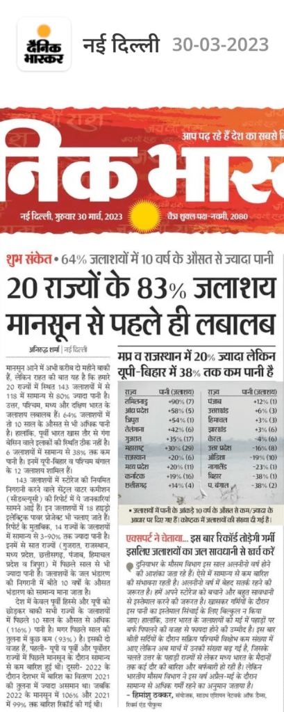 साउथ एशियन नेटवर्क ऑफ डैम्स, रिवर्स एंड पीपुल्स के संयोजक हिमांशु ठक्कर ने कहा कि दुनियाभर के मौसम विभाग इस साल अलनीनो वर्ष होने की आशंका जता रहे हैं। ऐसे में सामान्य से कम बारिश की संभावना रहती है। अलनीनो वर्ष में बेहद सतर्क रहने की जरूरत है। हमें अपने स्टोरेज को बचाने और बहुत सावधानी से इस्तेमाल करने की जरूरत है। खासकर गर्मियों के दौरान इस पानी का इस्तेमाल सिंचाई के लिए बिल्कुल न किया जाए। https://www.bhaskar.com/national/news/83-of-countrys-reservoirs-full-64-have-more-water-than-10-year-average-131101108.html (30 March 2023)