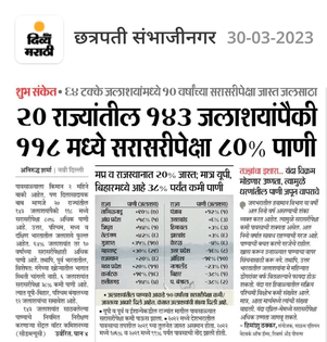 Rajasthan 99% of irrigated land in Jaipur sucks up groundwater The Central Groundwater Board Report 2022 (November) says that of the district’s 15 blocks, Govindgarh has the lion’s share with 40,000 hectares irrigated using groundwater. Blocks like Jhotwara and Sanganer lead in using groundwater for industrial purposes. All the blocks of Jaipur have recorded over-exploitation of groundwater. The report says in 2021, the district recorded a deficit of 918 million cubic metres of groundwater, mainly due to over-exploitation for irrigation purposes. The analysis of the decadal water level trend (2011-2020) indicates that the overall trend in the district is decline at an average rate of 0.50 metres per year. Calling the report alarming, R K Goyal, soil scientist and in charge of Central Arid Zone Research Institute (CAZRI), Ladakh, said that a two-way approach of water conservation and rainwater harvesting is required, at a war footing, else the water-scarce state will face a crisis soon. https://timesofindia.indiatimes.com/city/jaipur/99-of-irrigated-land-in-jaipur-sucks-up-groundwater-report/articleshow/98892703.cms (22 March 2023)