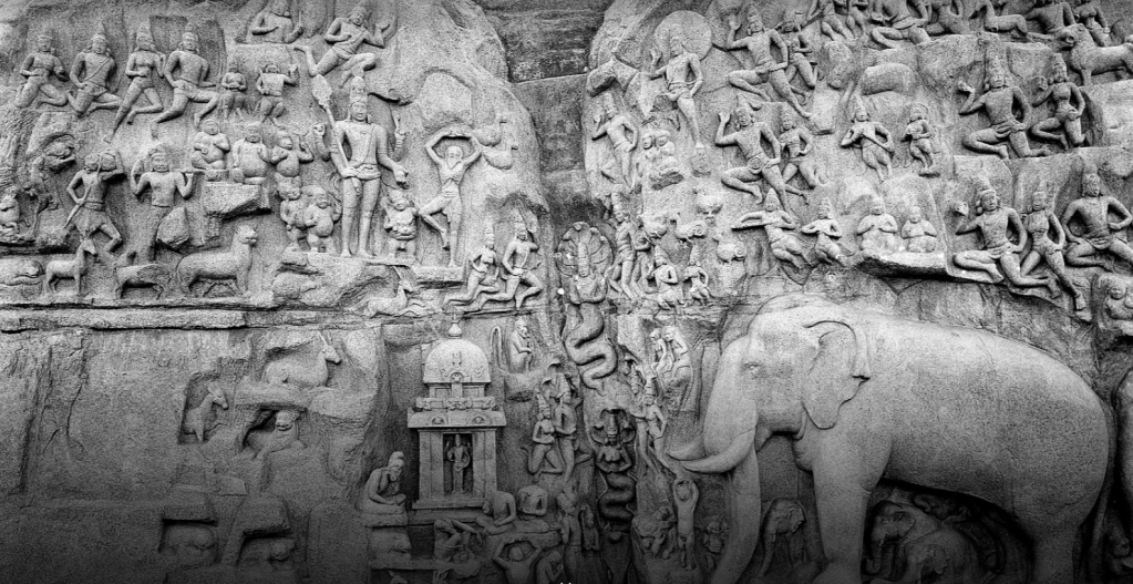 The Puranic story of Ganga’s descent can be found on rock cut panels in Mahabalipuram.