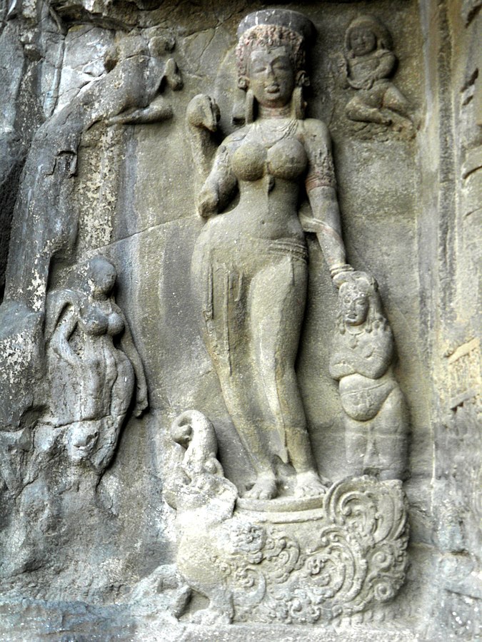 In the 5th cave of Udayagiri (near Vidisha, Madhya Pradesh), there is a sculpture of the Ganga and the Yamuna, created around 420-425 CE where both are ‘dvarpalas’ (doorkeepers) with both the goddesses mounted on their ‘vahanas’ or vehicles. Ganga is on ‘makara’ a mythical creature embodying all vegetal life and fearsome because of its similarity to a crocodile which has always connected the river to the seas (the known to the unknown).[2] Here too, the descent of Ganga has been projected but in a much miniature form. However, the narrative was so poetic that it inspired the tableau in Mahabalipuram.