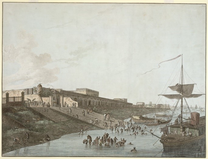 Both the Daniells, William Hodges, James Princep and several others focused on the ghats, the people, the ships and the growing settlements with the river flowing in front suggesting the utility of the ancient body in terms of living, commerce and beautification. [5]