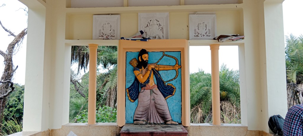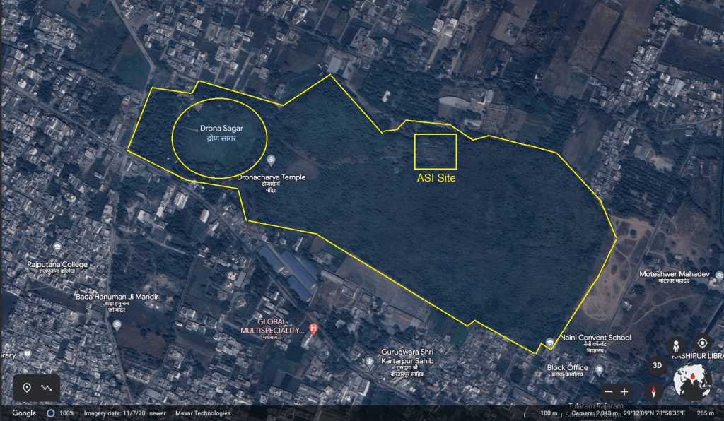 On another earth mound at some distance from ASI site, inhabits a shrine with Dronacharya’s etched statue on a mounted platform overlooking the lake.