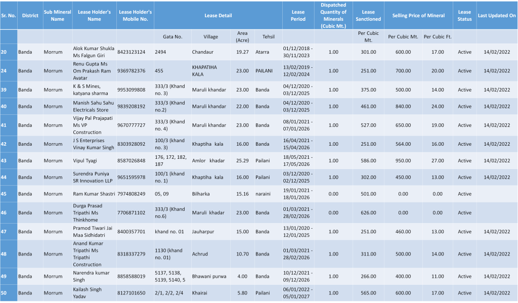 Of total 14 active sites 8 are in Banda, 4 in Pailani tehsil and 1 each in Ataraa and Naraini tehsils. These 14 sites cumulatively cover 241.22 acres of riverbed land leased out to mine 5574 cubic metre of morrum for next 3 to 4 years. The website has not been updated since February 2022 and mentioned only 12 cubic meter as dispatched minerals so far from these 14 active mines.