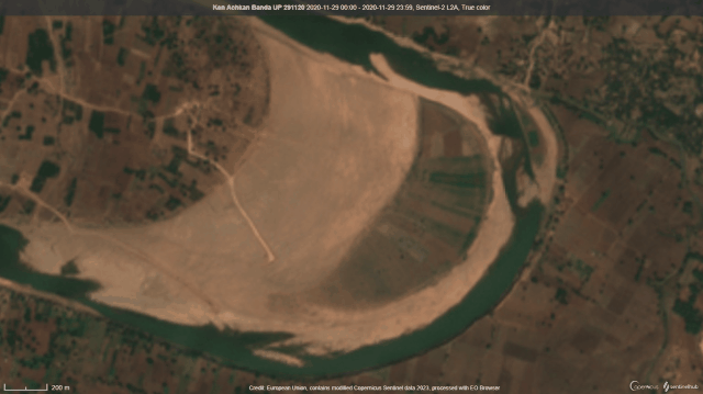 Ken river one of the important tributaries of Yamuna in lower segment has been witnessing industrial scale riverbed mining in Banda district of Uttar Pradesh. The Sentinel Hub satellite images reveal the mechanized mining of morrum (light orange colour sand) has been going on unabated at multiple locations in the district. Recent local media reports have also highlighted the illegalities and violations of the rules by the miners.