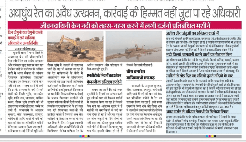 The relatives of politicians are reportedly involved in illegal sand mining businesses discouraging the concerned officials to initiate administrative actions. The sand miners have hired armed goons to threaten and harass the farmers, villagers for objecting to destructive mining activities. Fearing the mafias the affected villagers have even stopped raising complaints. The brazen mining operations have been adversely affecting the aquatic life, riverbed farmers, common grazing lands and ancient ghats along the Ken river in Ajaygarh.
