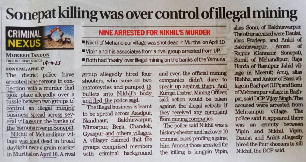 The illegal business is learnt to be spread across Asadpur, Nandnaur, Bakhtawarpur, Mimarpur, Bega, Chandoli, Gyaspur and others villages. A villager claimed that the groups comprised members with criminal background and even the official mining companies didn’t dare to speak up against them. Anil Kumar, District Mining Officer, said action would be taken against the illegal activity if they received any complaint from mining companies. https://www.tribuneindia.com/news/haryana/sonepat-killing-was-over-control-of-illegal-mining-498354 (18 April 2023) डीसीपी ने बताया कि यमुना क्षेत्र में अवैध रेत खनन पर वर्चस्व स्थापित करने की रंजिश में निखिल की हत्या की गई। इसके साथ ही रेत खनन करने वालों से वसूली भी की जाती थी। इससे लाखों रुपये महीने की आमदनी होती थी। इसको लेकर दोनों पक्षों में गैंगवार चल रही थी।आरोपित विपिन व निखिल गुट ने अपने गैंग बना लिए थे। इसके साथ ही धीरज बख्तावरपुर की हत्या के बाद से विपिन व निखिल गुट में टकराव बढ़ गया था। दोनों अपना वर्चस्व चाहते थे। इसके चलते ही निखिल ने विपिन की हत्या करा दी थी। https://www.jagran.com/haryana/sonipat-ncr-sonipat-history-sheeter-nikhil-killed-in-sand-mining-gang-war-three-sharp-shooters-were-called-from-up-23388422.html (17 April 2023) एसीपी ने बताया कि निखिल के साथ विपिन, दौलतराम ,अंकित की पुरानी रंजिश चल रही थी। इन्होंने ही उसे मारने के लिए शूटर्स बुलाए थे। धीरज, विपिन, दौलतराम और अंकित का ग्रुप रेत खनन का काम करता है। मृतक निखिल भी रेत खनन के धंधे में था। रेत खनन को लेकर इनमें रंजिश चल रही थी। https://www.bhaskar.com/local/haryana/sonipat/news/sonepat-mehandipur-village-history-sheeter-nikhil-murder-case-sand-illegal-mining-enmity-4-special-shooters-sonipat-police-131175264.html (17 April 2023)