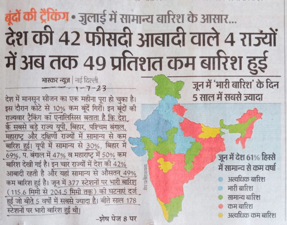 The instances of high rainfall events in June 2023 were the highest in last five years. There were such instances in 377 stations in June 2023. (Dainik Bhaskar1 July 2023)