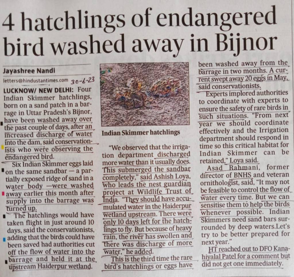 The hatchlings would have taken flight in just around 10 days, said the conservationists, adding that the birds could have been saved had authorities cut off the flow of water into the barrage and held it at the upstream Haiderpur wetland. “We observed that the irrigation department discharged more water than it usually does. This submerged the sandbar completely,” said Ashish Loya, who leads the nest guardian project at Wildlife Trust of India. https://www.hindustantimes.com/india-news/tragic-loss-endangered-indian-skimmer-hatchlings-washed-away-due-to-increased-water-discharge-in-up-barrage-101688064578122.html (30 June 2023)