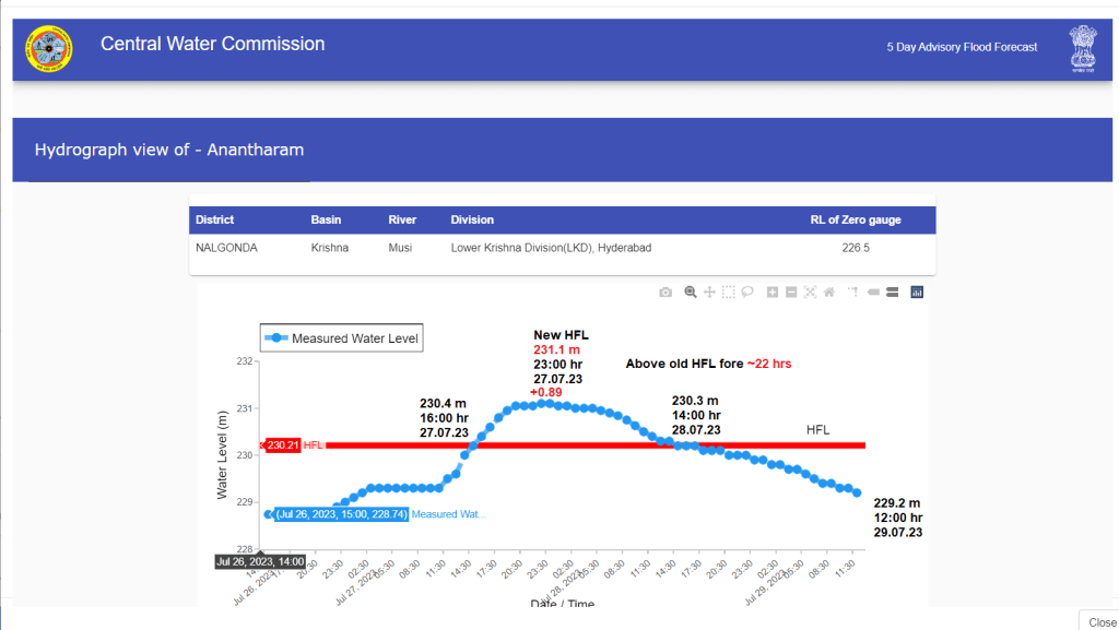 River Musi in Krishna basin at Anantharam site in Nalgonda district has breached old HFL 230.21 meter dated 14.10.2020 at 16:00 hour on 27.07.2023.