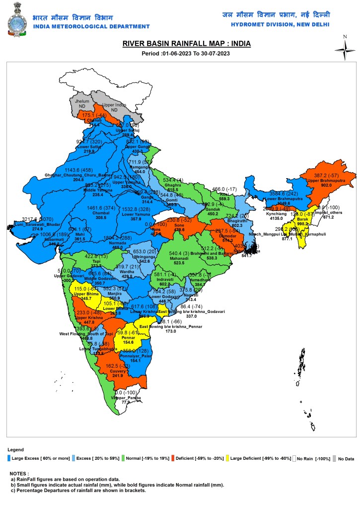 River Wardha in Godavari basin at Sirpur town site in Kumuram Bheem district has flown parallel to its HFL 162.57 meter dated 15.07.2022 for 6 hours and started receding. Present flood level is 162.49 meter at 21:00 hour on 24.07.2023 and forecasted to decline further to 161.63 meter at 09:00 hour on 25.07.2023. The old HFL for the site was 161.34 meter attained on 18.08.2018.