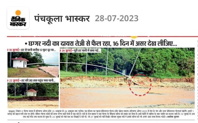 Panchkula Cops will be deployed at Ghaggar river to check dumping of waste To check immersion of religious offerings in Ghaggar, a police team will be deployed to penalise people who stop vehicles on the river’s bridge for throwing waste in it. This was stated by the Panchkula deputy commissioner before the principal bench of the NGT. The submission came in response to a petition by one Meenu Devi on July 25. https://www.hindustantimes.com/cities/chandigarh-news/police-team-deployed-to-penalise-those-throwing-waste-in-river-ngt-orders-compliance-with-pollution-control-guidelines-101690412673169.html (27 July 2023)