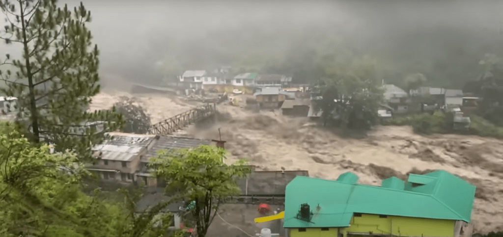(Feature Image:- Deluge in Pin Parbati river engufling riverbank habitations in Sainj market on July 09, 2023. Source: Anil Khatri Vlogs)