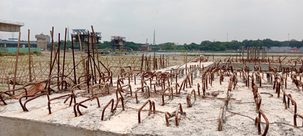 DMRC giant concrete slabs dumped in Yamuna riverbed downstream Wazirabad Barrage in June 2023. SANDRP