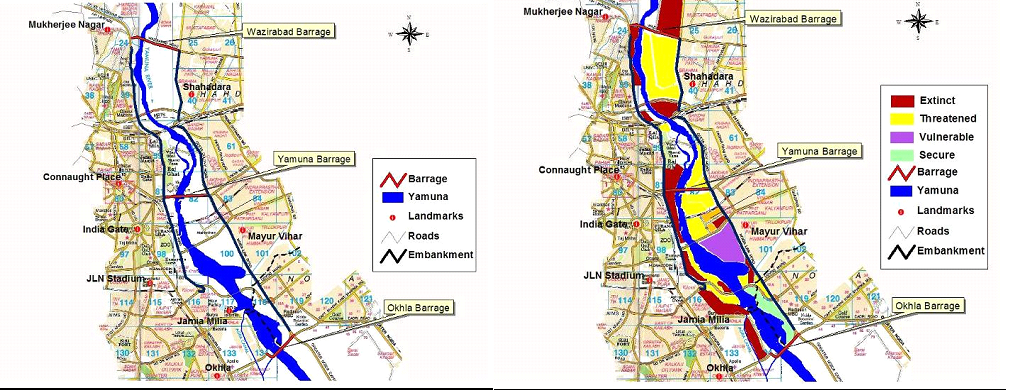 Maps in Usha Mehra committee report showing growing encroachments of Yamuna floodplain in Delhi.