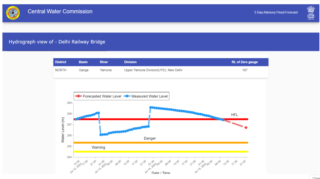 Delhi During unusual flood spell in Yamuna in second week of July 2023, the river not only breached the highest flood level (HFL) of 207.49 meter dated 06.09.1978 at the Delhi Railway Station level forecast site but also unexpectedly rose by 1.17 m rise and set 208.66 m as new HFL on 13.07.2023.