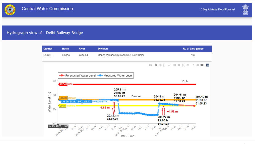 (Feature Image: CWC’s Delhi Railway Bridge forecast site showing abrupt changes in Yamuna water level during unusual flood spell in July 2023)