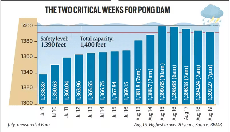 – The Bhakra and Pong dams were full (water level at Bhakra on Aug 14: 1678 ft against FRL of 1680 ft and at Pong dam at almost 1400 ft against FRL of 1390 feet) and beyond full respectively by middle of Aug this year (According to BBMB, this happened only once, in 1988 before this), which should not have been the case. The dams should have been full only closer to the end of monsoon, around Sept 20. The fact that the dams were this full by Aug 15 is complete violation of rule curve.