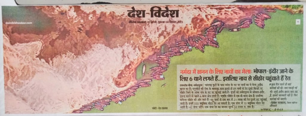 बारिश के बाद भी नर्मदा से रेत का उत्खनन और परिवहन जारी है। दिन के अलावा रात में भी गहरे पानी में मशीनों से उत्खनन किया जा रहा है। शुक्रवार-शनिवार की दरमियानी रात भी भैरूंदा के पास आंबा में मशीनों से रेत खनन किया जा रहा था तभी नर्मदा में अचानक जलस्तर बढ़ गया और अफरा-तफरी मच गई। इसी दौरान जैसे-तैसे मशीनें तो निकाल ली गई, लेकिन डंपर डूब गया। इसके ड्राइवर ने तैरकर अपनी जान बचाई। शनिवार शाम तक पानी से डंपर नहीं निकाला जा सका। वहीं इस मामले में जिला खनिज अधिकारी राजेंद्र परमार का कहना है कि जो वीडियो वायरल हो रहा है वह तीन-चार दिन पुराना है। डंपर खराब हो गया था जो तीन-चार दिन से वहीं खड़ा था। https://www.bhaskar.com/local/mp/sehore/news/sudden-rise-in-water-level-during-sand-mining-in-narmada-river-dumper-drowned-driver-saved-his-life-by-swimming-131471609.html