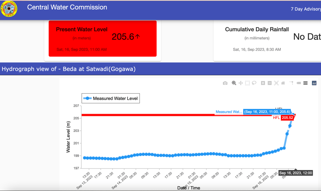 Starting early hours on Sept 16, there were almost a dozen sites in the Narmada valley on CWC flood forecasting monitoring, where the water level had already breached the previous Highest Flood Levels (HFL), some of these were: