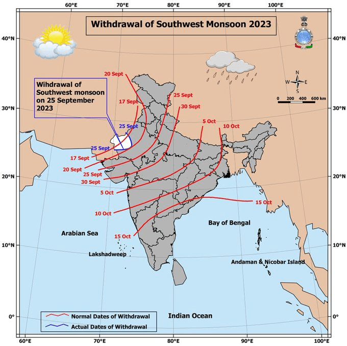 The monsoon will begin withdrawing from west Rajasthan around September 25, roughly 8 days later than when it usually begins receding, officials said on Friday (Sept. 2022), adding that a recent surge in rains has cut a 10% deficiency in precipitation at the end of August to 6% on Friday (Sept. 22). But that gap is unlikely to change much and rains are now expected to reduce over northwest and adjoining west central India over the next 5 days, the India Meteorological Department said, describing the conditions as “favourable for withdrawal of southwest monsoon from parts of West Rajasthan from around September 25”. The normal date for monsoon withdrawal to begin is September 17 and completely withdraw by October 15. The monsoon season officially ends on September 30. https://www.hindustantimes.com/india-news/monsoon-withdrawal-likely-from-sept-25-imd-101695408750197.html (23 Sept. 2023)
