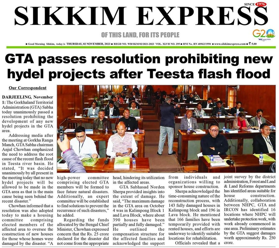 4. W BENGAL GTA passes resolution against new hydro projects On Nov 1, 2023, the Gorkhaland Territorial Administration resolved not to allow any new hydro project in GTA area.The decision was taken following the Oct. 03-04 GLOF devastation from South Lonark Lake.